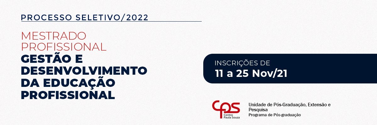 A Unidade de Pós-Graduação, Extensão e Pesquisa do Centro Paula Souza abre inscrições para o Mestrado Profissional em Gestão e Desenvolvimento da Educação Profissional 2022.