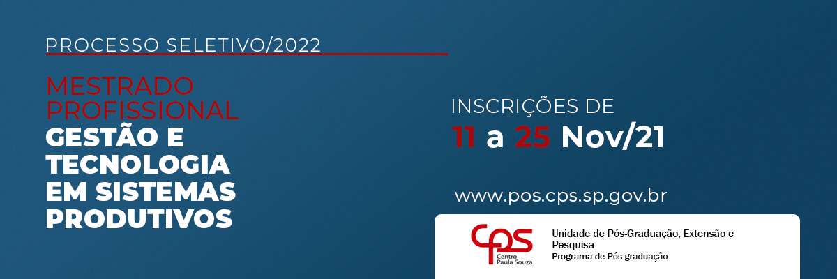 A Unidade de Pós-Graduação, Extensão e Pesquisa do Centro Paula Souza abre inscrições para o Mestrado Profissional em Gestão e Tecnologia em Sistemas Produtivos 2022.