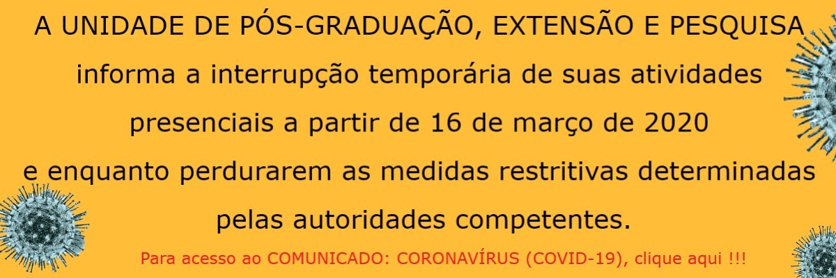 A UNIDADE DE PÓS-GRADUAÇÃO, EXTENSÃO E PESQUISA informa a interrupção temporária de suas atividades presenciais a partir de 16 de março de 2020 e enquanto perdurarem as medidas restritivas determinadas pelas autoridades competentes.