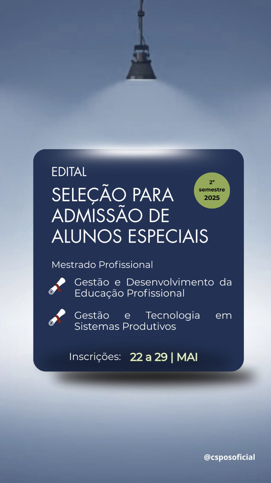 Alunos especiais são os matriculados apenas em disciplinas isoladas dos cursos de Mestrado (Stricto Sensu), apenas a estas vinculadas, e portanto, não vinculados aos programas de pós-graduação do CEETEPS que conduzem aos títulos de mestre ou de doutor.