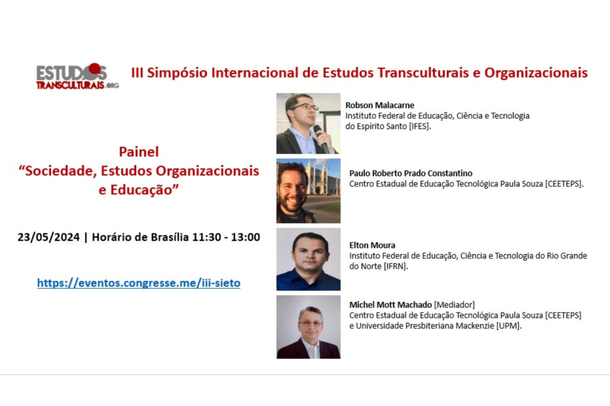 Os professores Paulo Roberto Prado Constantino e Michel Mott Machado (mediador), ambos do Programa de Mestrado Profissional em Gestão e Desenvolvimento da Educação Profissional, participaram do Painel “Sociedade, Estudos Organizacionais e Educação”, durante o III Simpósio Internacional de Estudos Transculturais e Organizacionais (SIETO), no dia 23 de maio de 2024, online. O evento é promovido pela Associação Internacional de Estudos Transculturais e Organizacionais pela (AIETORG), entidade sediada em Lisboa, Portugal. O referido painel também contou com a participação dos professores Robson Malacarne (IFES) e Elton Moura (IFRN). Para mais informações sobre o SIETO e a AIETORG, consultar os sites: